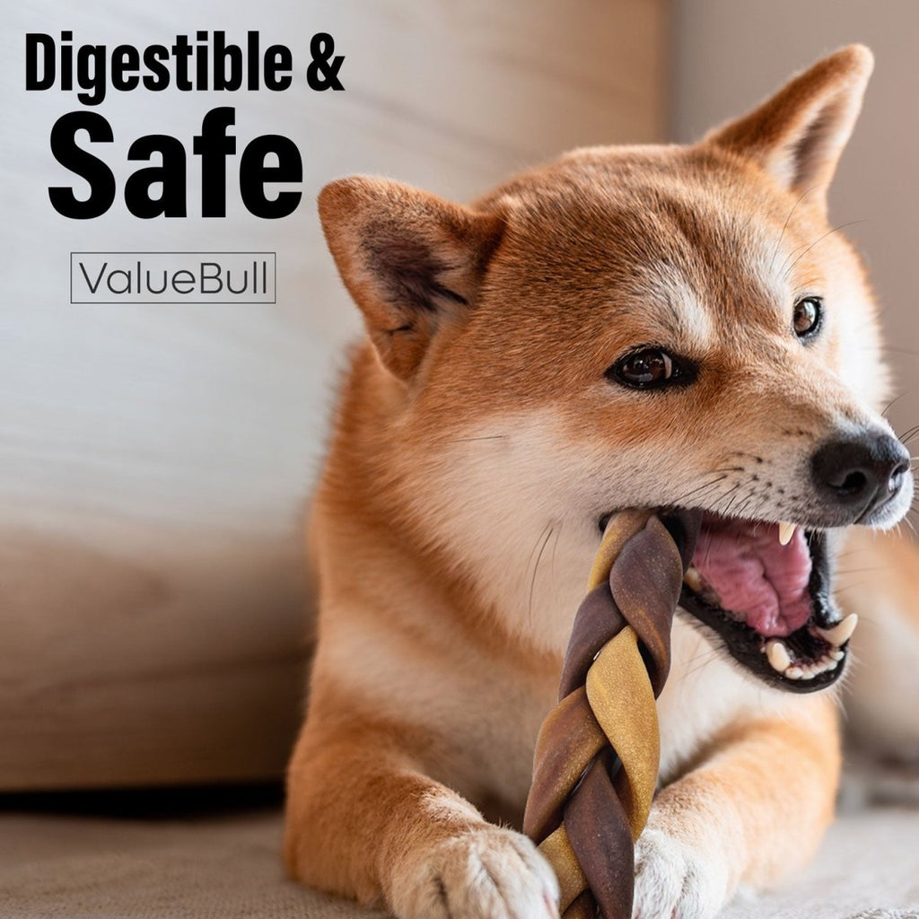 ValueBull 6 Inch Medium Beef Collagen Braids are the real deal. Crafted from a single sheet of the inner, collagen-rich layer of beef skin known as corium, Collagen brings benefits to nearly every part of your beloved pup. It starts with the gentle and natural dental and jaw muscle benefits of chewing a durable treat. From there, the highly digestible collagen is quickly converted into essential amino acids that help rebuild and repair your dog's muscles, reduce inflammation throughout the body, strengthen bones and joints, and even moisten and shine your dog's skin and coat so they can look as good as they feel. Like our famous bully sticks, healthy collagen beef sticks are a long lasting chew, basted in beefy broth for a flavor and aroma your dog will crave.