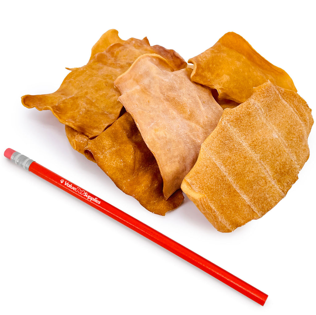 ValueBull USA Chicken Flavored Beef Collagen Chips are made from a single sheet of corium, the inner layer of beef skin rich in collagen. Collagen helps your dog in many ways: it cleans their teeth and strengthens their jaw muscles, it rebuilds and repairs their muscles, it reduces inflammation, it supports their bones and joints, and it improves their skin and coat. These treats are long-lasting, basted in beefy broth, and highly digestible. We hand inspect all-natural treats for quality and consistency; some natural variation is to be expected. Quantity is estimated based on average weight.